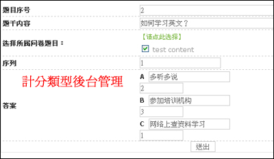 計分類型的問卷系統,是在管理後台建立試卷名稱,新增題目,每個題目下面會有幾個選項(選項可以根據需要設定),後台可以設定不同的選項對應不同的分值。答題者選擇完畢後,系統會根據答題情況,計算出總的分數,根據後台設定的不同分值範圍,顯示出不同的文字說明或建議,使答題者一目了然的知道自己哪些方面不足還需改進,以達到測試統計的目的。