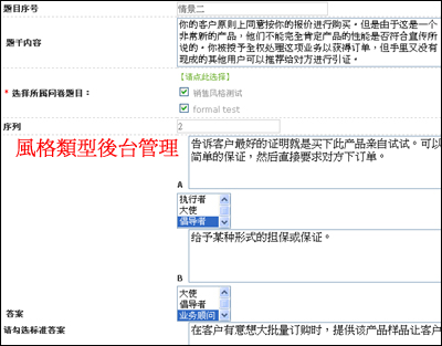 風格類型的問卷系統,管理者在後台設定幾種風格類型,每種風格用不同的試題及選項來對應,根據答題者的選擇,來判斷答題者屬於怎樣風格類型的人,並就這種風格給出解釋或建議。