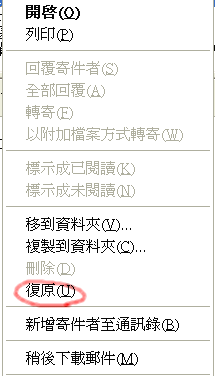如果您想回覆上一步驟圈選的信件,請在該封信件的標題上按滑鼠右鍵出現以下選單,請選擇恢復
